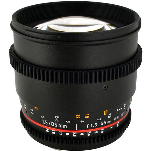 The Rokinon 85mm T1.5 Cine Lens for EF mount produces a telephoto angle-of-view on full-frame sensors. It features a very fast maximum aperture of T1.5 and an 8 blade iris, for shallow depth of field with attractive bokeh. The focus and aperture control rings are outfitted with industry standard gearing, which provides an interface for working with a traditional follow focus. The aperture control ring has also been "declicked", which facilitates smooth iris pulls.